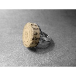 Exclusivo anillo, de este modelo no se ha fabricado mas que una unidad, ecológico realizado con papel reciclado y barniz ecológico al agua. En tonos color beige y negro. Con base del anillo extensible en color plateado, libre de plomo y níquel.