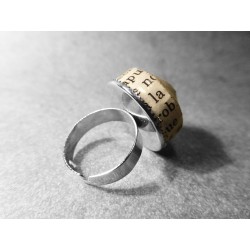Exclusivo anillo, de este modelo no se ha fabricado mas que una unidad, ecológico realizado con papel reciclado y barniz ecológico al agua. En tonos color beige, negro y forma cónica. Con base del anillo extensible en color plateado, libre de plomo y níquel.