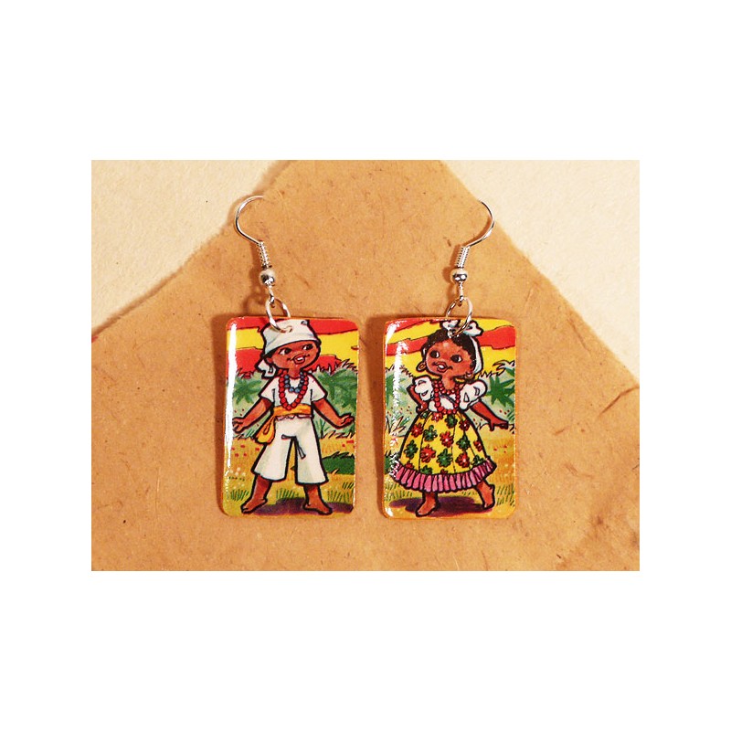 PAR DE PENDIENTES con CROMOS troquelados ORIGINALES, tratado para darle dureza e impermeabilidad de forma totalmente artesana. Esta hecho con una base de papel, tela, barniz y adhesivo.