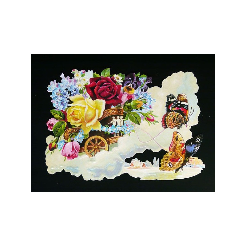 Cromo troquelado gigante y gran grosor alemán de 16 cm. EF BK 5127 · Carro con Flores y Mariposas ·