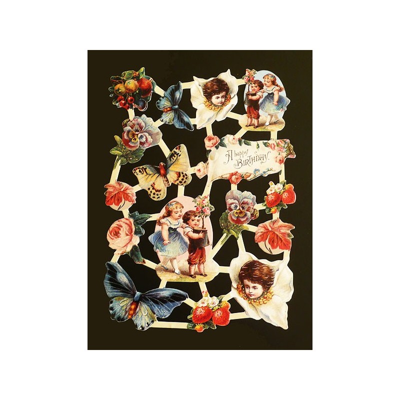 Lámina de cromos troquelados holandeses con brillo n. 11 · NIÑOS VICTORIANOS, MARIPOSAS Y FLORES ·
