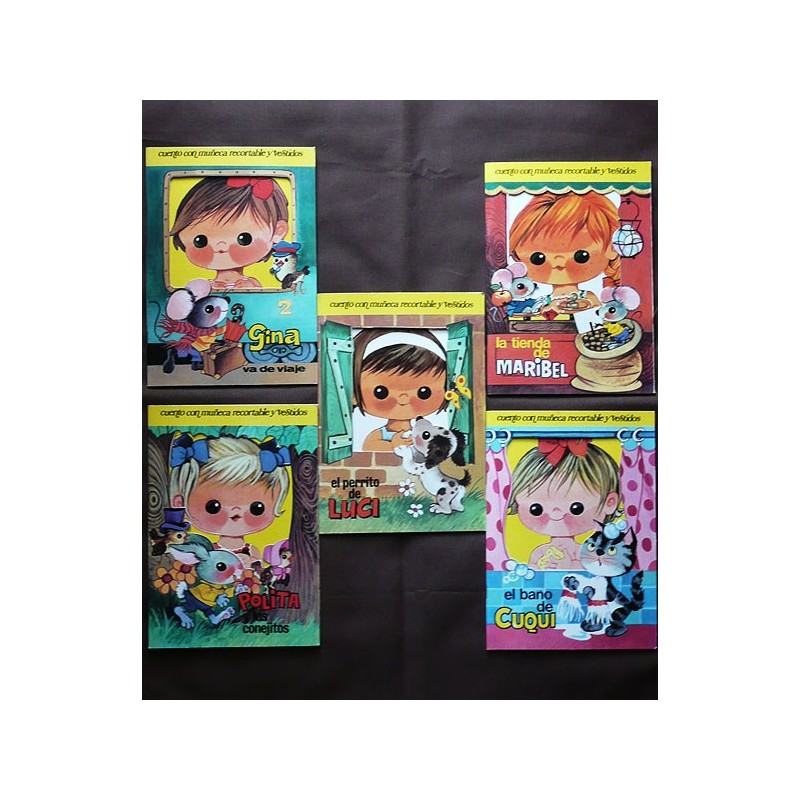 5 cuentos con muñeca recortable y peana en cartón y 4 hojas, 2 de ellas son vestidos para recortar.