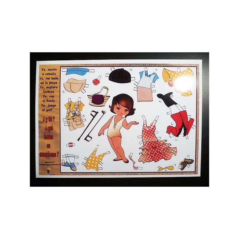 REPRODUCCION de extraordinaria calidad en cartulina brillante de Muñeca recortable promocional del Ayuntamiento de Almonte, con vestidos y accesorios para El Rocío, para visitar el parque de Doñana e ir a la playa. DIFICIL DE CONSEGUIR. Comercializadas unicamente durante la Feria del Rocío. Tamaño 21 x 29 cm.