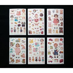Set de 6 preciosas láminas adhesivas retro con muñecas paper dolls y juguetes.