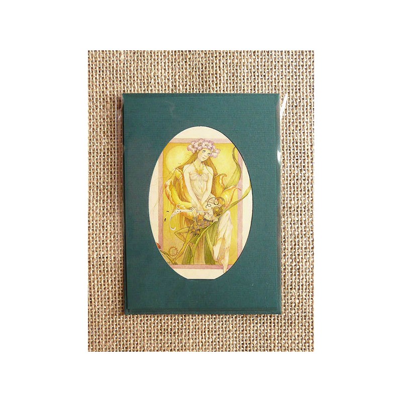 El set está compuesto por un sobre de papel, una cartulina base de dos hojas con forma troquelada en su parte frontal, una hoja suelta de papel verjurado en el mismo tono que el resto y una preciosa lámina ilustrada sin pegar, así tu puedes elegir tu propia composición postal, decidir donde ubicar tu imagen y en caso necesario el texto que se requiera.