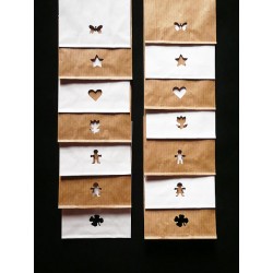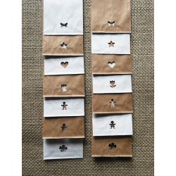 Elige del desplegable el modelo que prefieres para troquelar tus bolsas entre estos: Mariposa, flor, corazón, niño, niña, estrella y trebol de 4 hojas. El troquel se realiza de forma manual por lo que su ubicación puede variar algún milímetro.