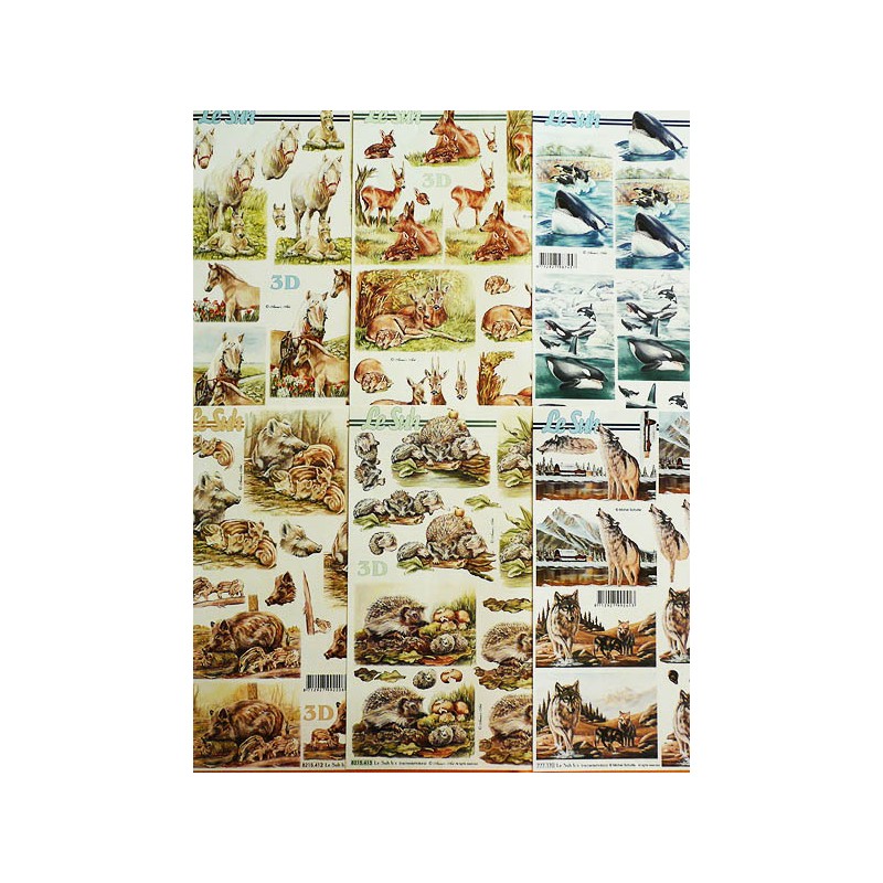 Tema - Animales. Lote de 6 laminas recortables de papel couché brillante para hacer manualidades en 3D. Tam. A4.